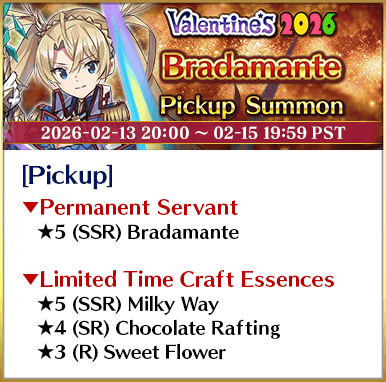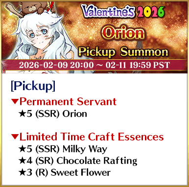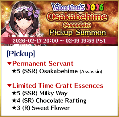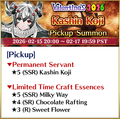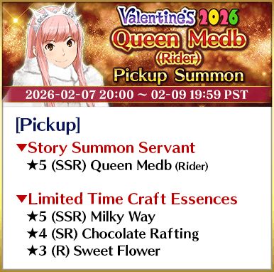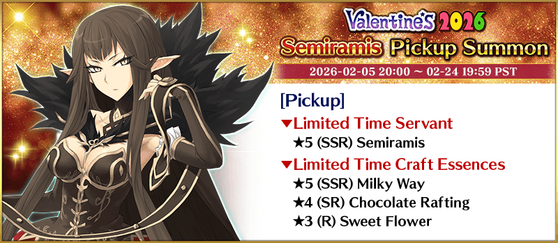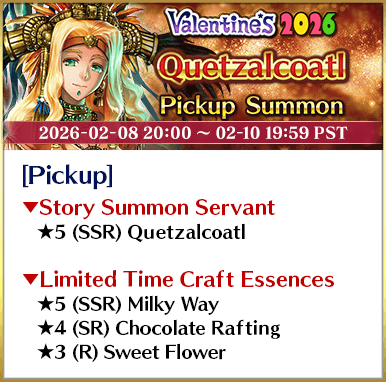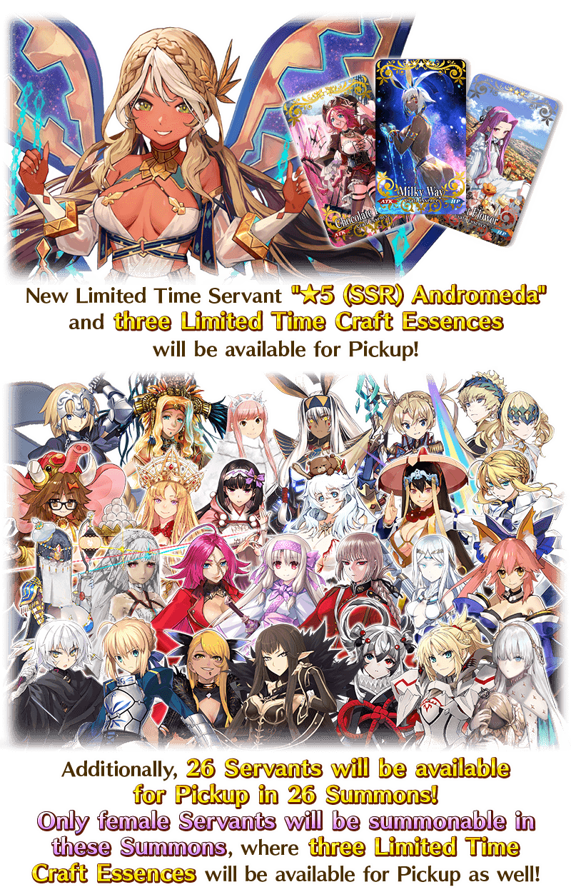 To celebrate the release of the Limited Time Event "Valentine's 2026 - Beyond the River of Chocolate", new Limited Time Servant "★5 (SSR) Andromeda" and three Limited Time Craft Essences will be available for Pickup!