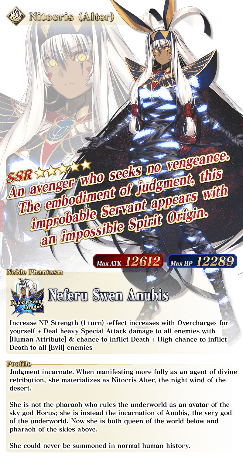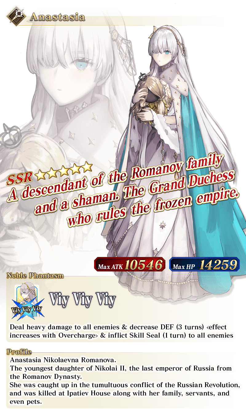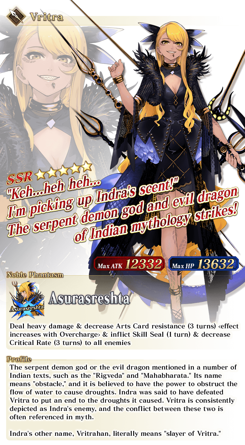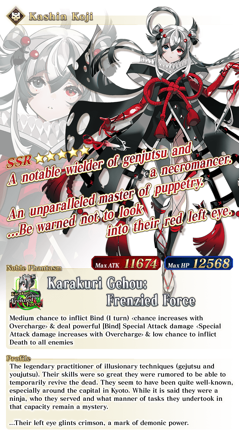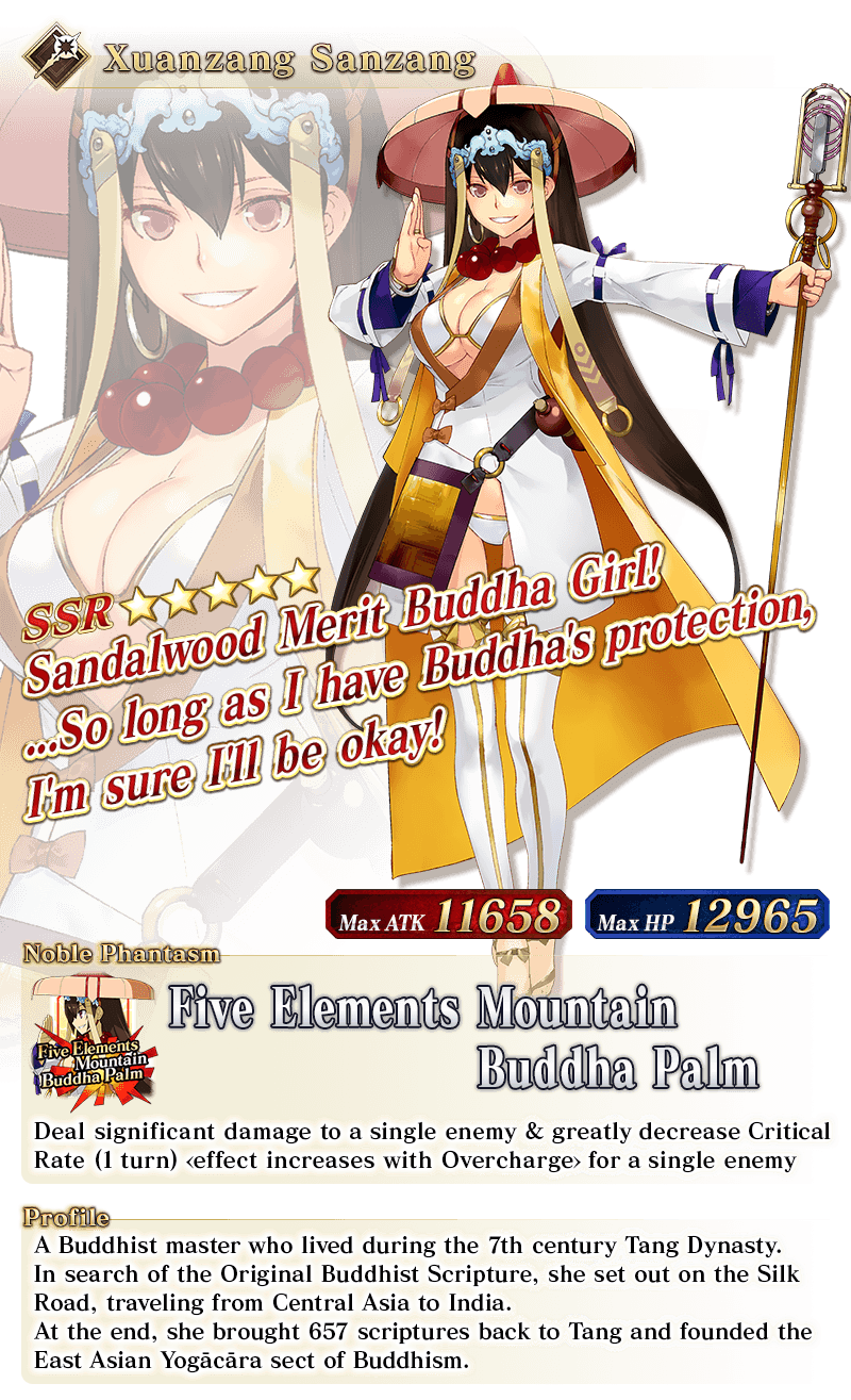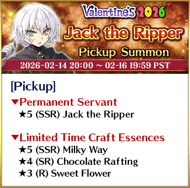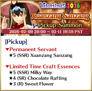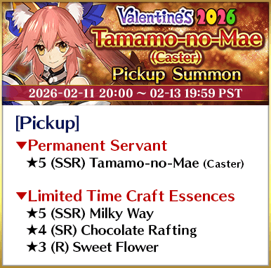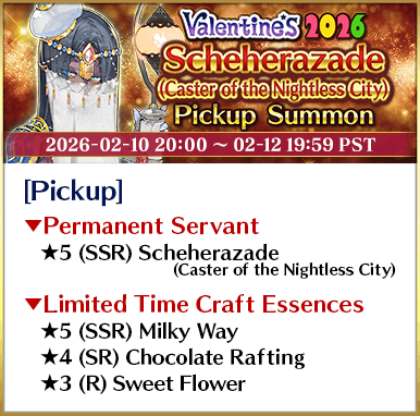 * The guaranteed ★4 (SR) or above card can be either a Servant or a Craft Essence. * The distribution rate for the guaranteed ★3 (R) or above Servant will differ from that listed on the "Summon Info" screen. * As of 2021-01-01 00:00 PST (GMT -8), Servants whose True Names are hidden will be referred to by their True Name within newly released Main Story chapters, Limited Time Events, certain quests, campaigns, and Pickup Summons.