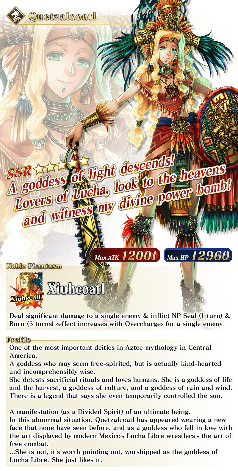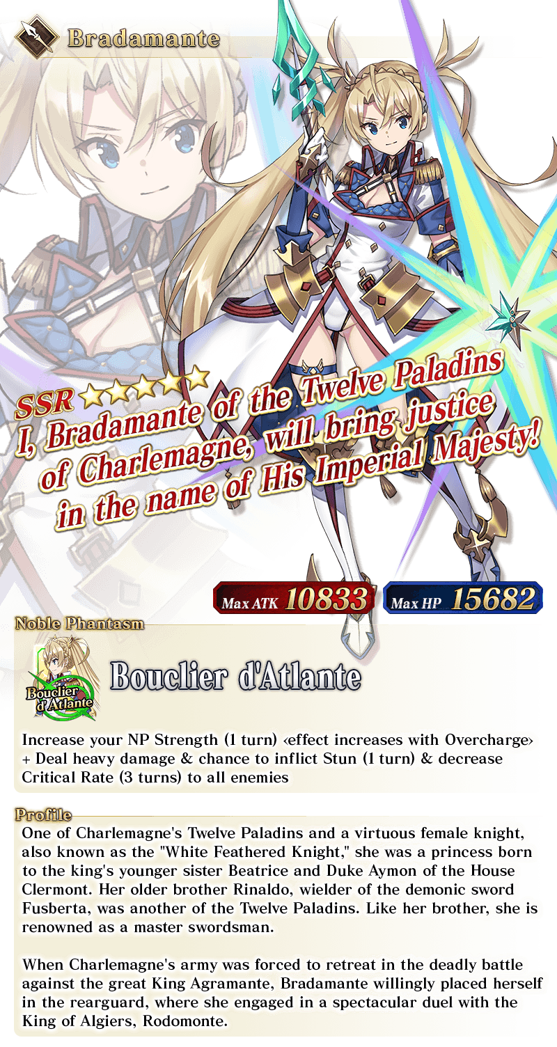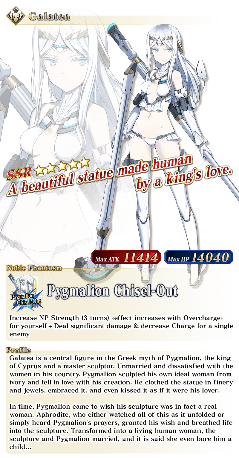 About Featured Servants: * The following Limited Time Servant(s) will only be summonable from the Summon Lineup(s) where they are featured as a Pickup Servant. In addition, they will not be added to Story Summon after the Pickup Summon period ends. - ★5 (SSR) Andromeda - ★5 (SSR) Semiramis * The following Story Summon Servant(s) will be summonable only from Story Summon and the Summon Lineup(s) where they are featured as a Pickup Servant. In the Summon Lineup(s) where they are featured as a Pickup Servant, they will be summonable even if they have not yet been added to Story Summon through story progression. No other Servants added to Story Summon through story progression will be summonable. - ★5 (SSR) Altria Pendragon (Lancer) - ★5 (SSR) Queen Medb (Rider) - ★5 (SSR) Quetzalcoatl - ★5 (SSR) Sitonai * In addition to Servants whose gender is listed as "Female", the following Servant(s) will be summonable. - ★5 (SSR) Dioscuri - ★5 (SSR) Enkidu - ★5 (SSR) Kashin Koji - ★4 (SR) Chevalier d'Eon - ★4 (SR) Astolfo (Rider) * The following Servant(s) will continue to be available through Story Summon after the Pickup Summon period ends. - Story Summon Servants who are featured as Pickup Servants - Permanent Servants who are featured as Pickup Servants * The name displayed for Servants whose True Names are hidden will change based on story progression. In some cases, the name displayed for their Noble Phantasm will also change. * The name displayed for ★5 (SSR) Jinako Carigiri (Great Stone Statue God) will change from "★5 (SSR) Great Stone Statue God" to "★5 (SSR) Jinako Carigiri" with Stage 2 Ascension.