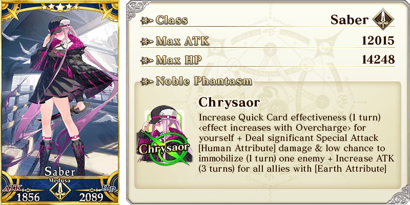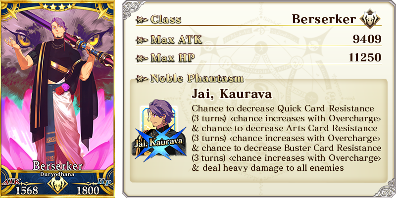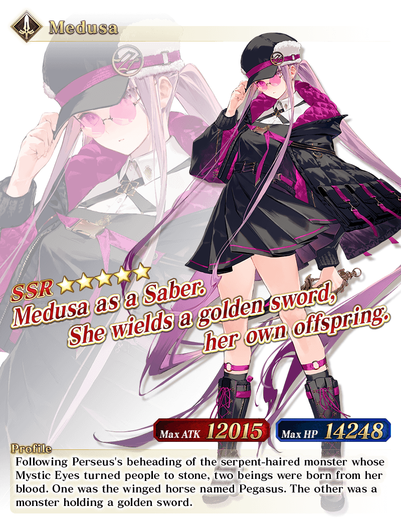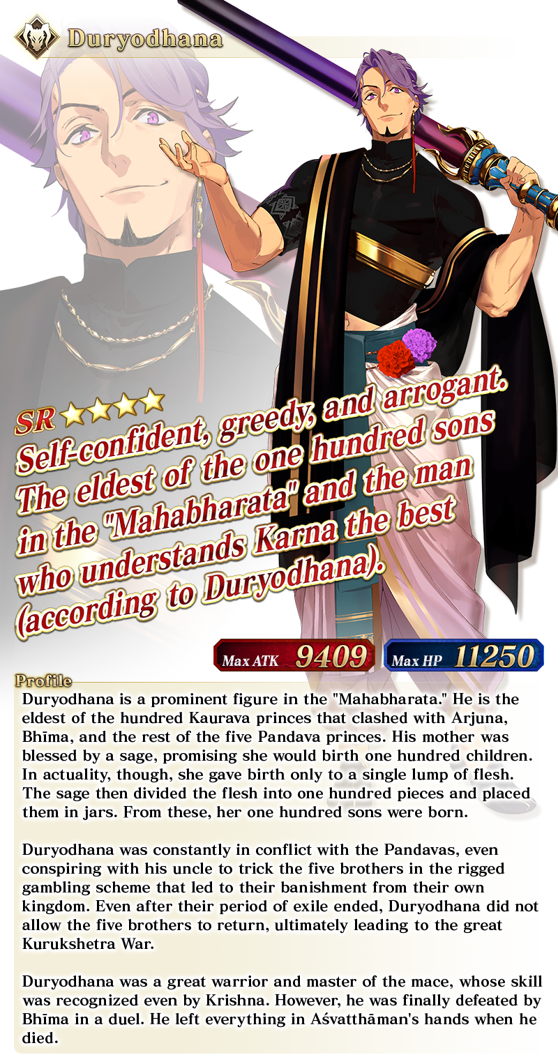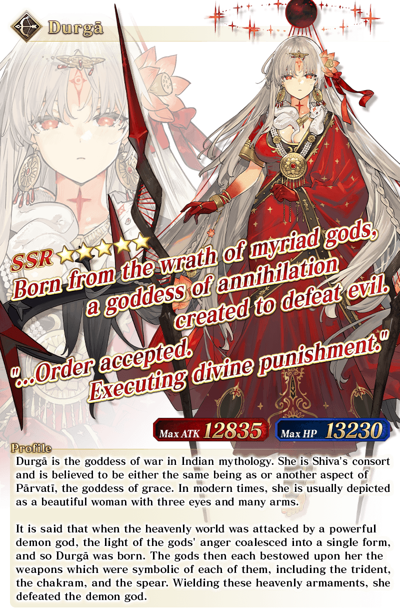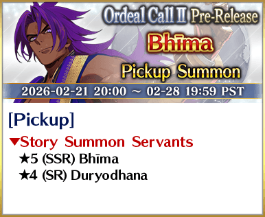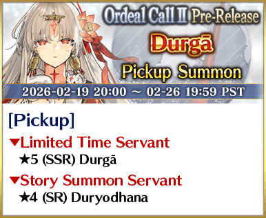 About Featured Servants: * The following Limited Time Servant(s) will only be summonable from the Summon Lineup(s) where they are featured as a Pickup Servant. In addition, they will not be added to Story Summon after the Pickup Summon period ends. - ★5 (SSR) Medusa (Saber) - ★5 (SSR) Durgā * The following Story Summon Servant(s) will be summonable only from Story Summon and the Summon Lineup(s) where they are featured as a Pickup Servant. In the Summon Lineup(s) where they are featured as a Pickup Servant, they will be summonable even if they have not yet been added to Story Summon through story progression. In addition, they will continue to be available through Story Summon after the Pickup Summon period ends. No other Servants added to Story Summon through story progression will be summonable. - ★5 (SSR) Bhīma - ★4 (SR) Duryodhana