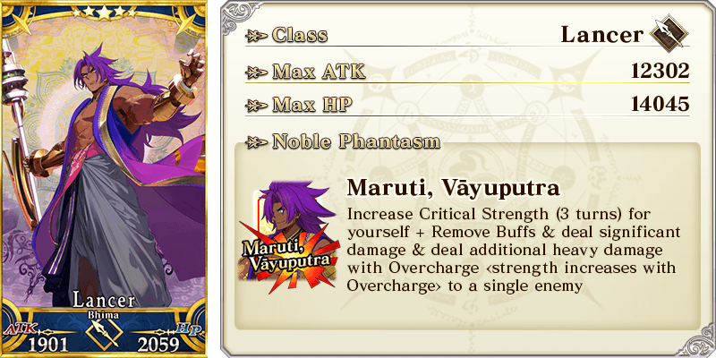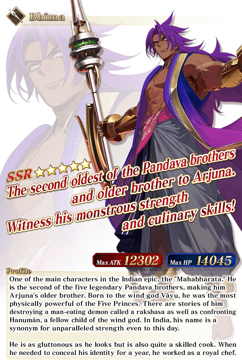 * The Noble Phantasm name and animations displayed for ★5 (SSR) Durgā will change when her battle sprite is set to Stage 3 Ascension. * The animations displayed for Bhīma's Noble Phantasm will change with Overcharge. The above features his Noble Phantasm with Overcharge.