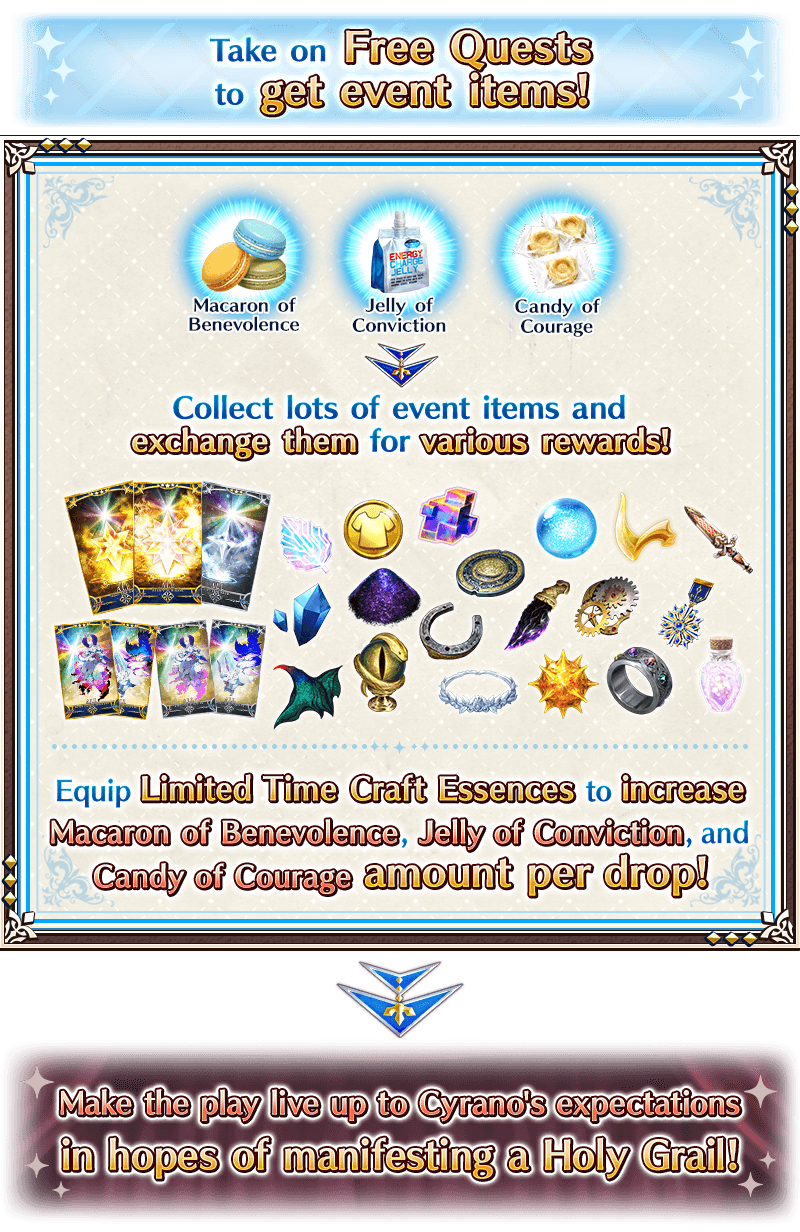 Equip the Limited Time Craft Essences available for Pickup through the Saint Quartz Summons ongoing during this event to receive a bonus to the amount per drop of event items Macaron of Benevolence, Jelly of Conviction, and Candy of Courage.
