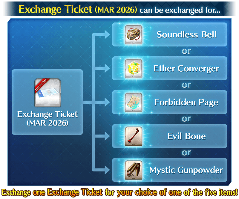 The "Exchange Ticket (MAR 2026)" available as a daily login bonus and daily mission rewards will be exchangeable for the following items.