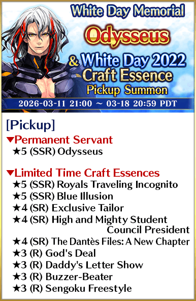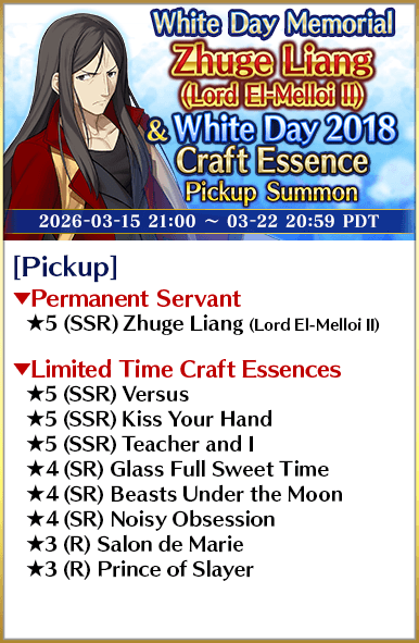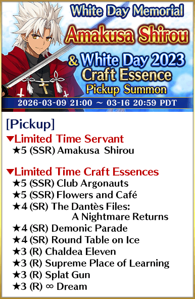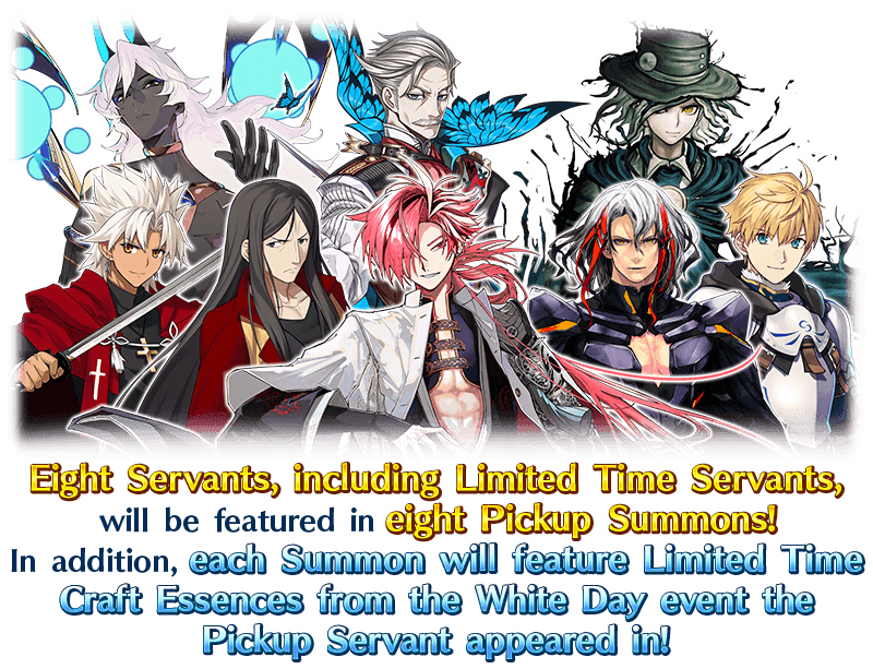 Eight Servants and 70 Limited Time Craft Essences from past White Day events will be featured in eight rotating Pickup Summons!