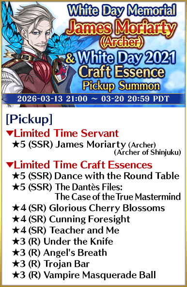 * The guaranteed ★4 (SR) or above card can be either a Servant or a Craft Essence. * The distribution rate for the guaranteed ★3 (R) or above Servant will differ from that listed on the "Summon Info" screen. * As of 2021-01-01 00:00 PST (GMT -8), Servants whose True Names are hidden will be referred to by their True Name within newly released Main Story chapters, Limited Time Events, certain quests, campaigns, and Pickup Summons.