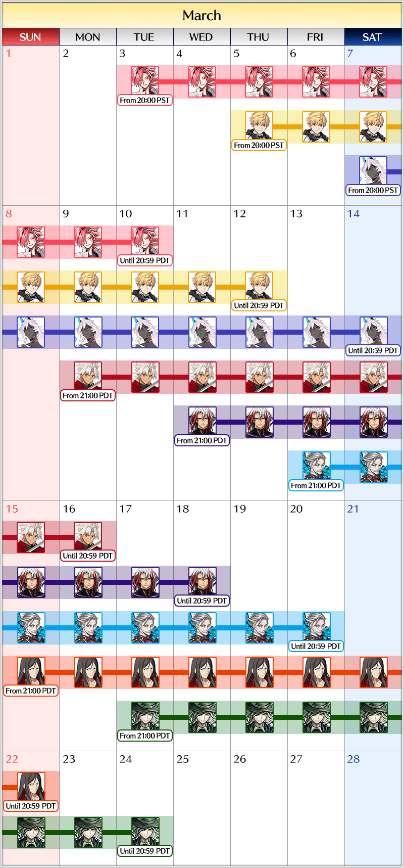 - If multiple Limited Time Pickup Summons are available at once, the number of summons you have performed will be counted individually for each Pickup Summon (each page on the Summon Screen). In addition, summons will be counted individually for each Summon Period that the Pickup Lineup changes for a Daily Pickup Summon. For example, in a Daily Pickup Summon where the Pickup Lineup changes each day at 20:00 PST (GMT -8)/21:00 PDT (GMT -7), your summon count will be reset at the moment the Pickup Lineup changes.