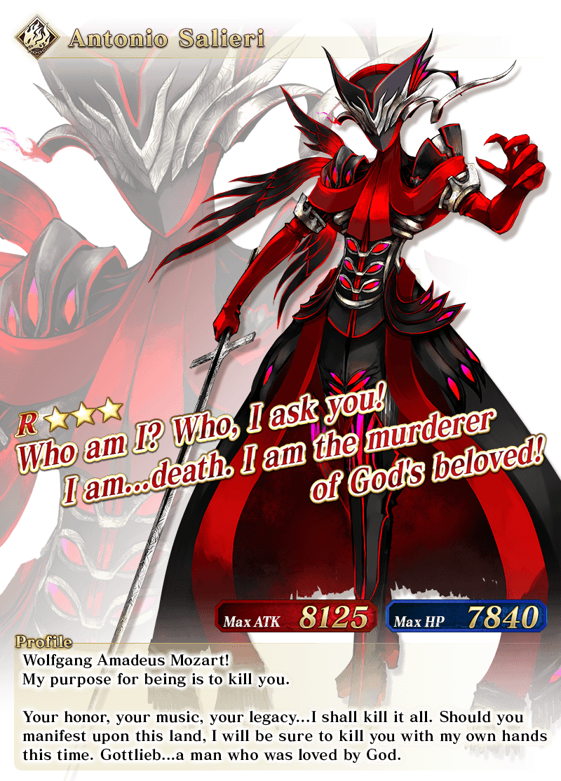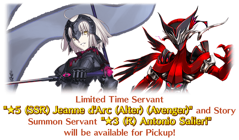 To commemorate the release of "Ordeal Call II: The Inescapable Gehenna, Id", Limited Time Servant "★5 (SSR) Jeanne d'Arc (Alter) (Avenger)" and Story Summon Servant "★3 (R) Antonio Salieri" will be featured in this Pickup Summon!