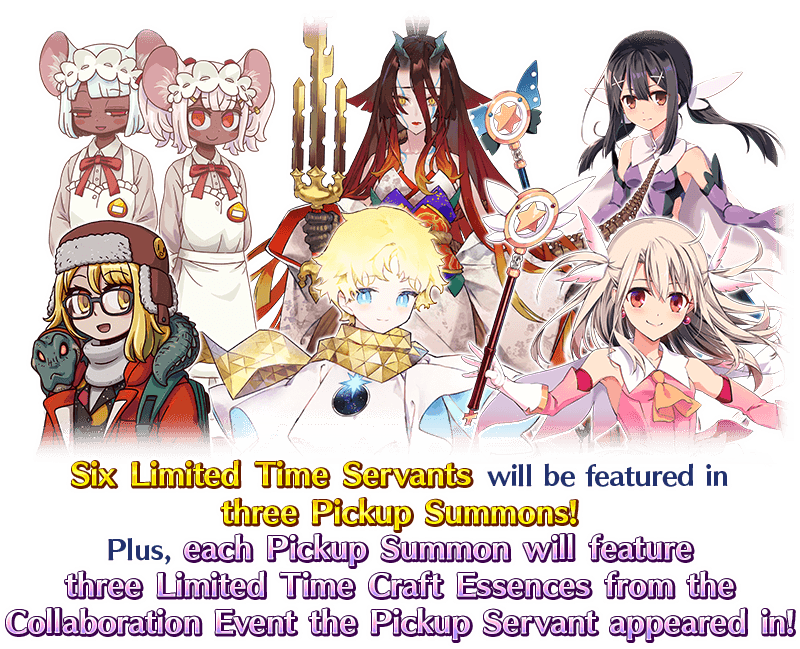 To celebrate the release of a collaboration event, six Limited Time Servants and nine Limited Time Craft Essences from past collaboration events will be featured in three Pickup Summons! These Pickup Summons will be available on a rotating schedule.