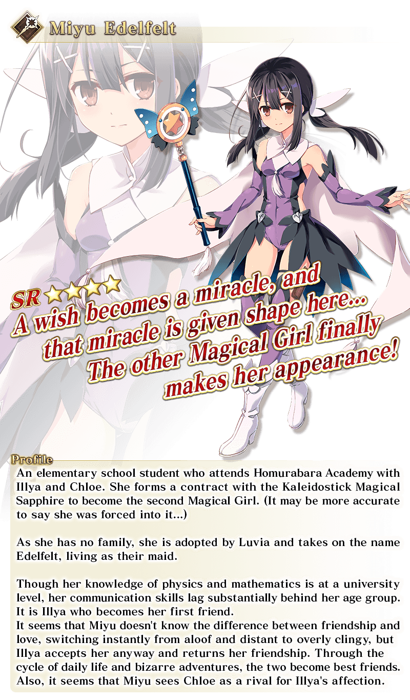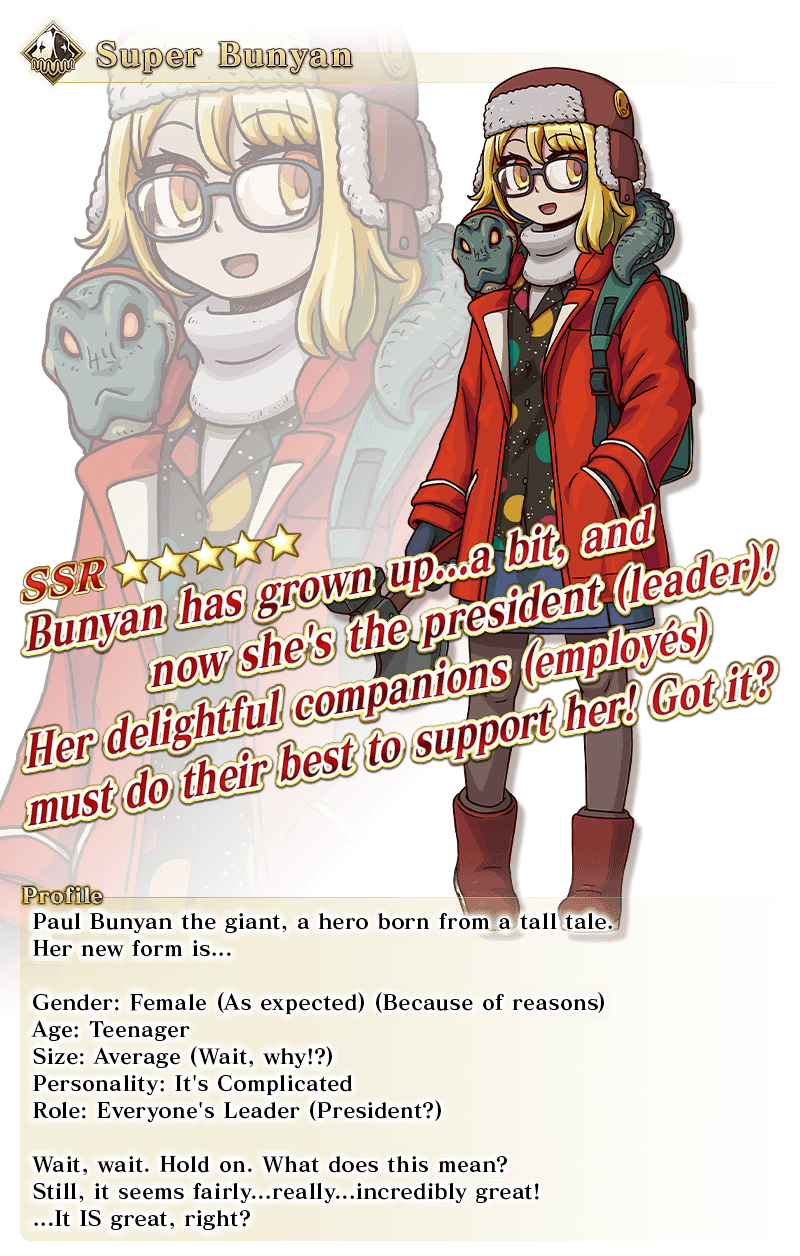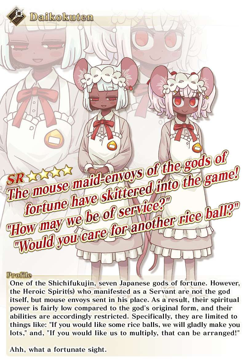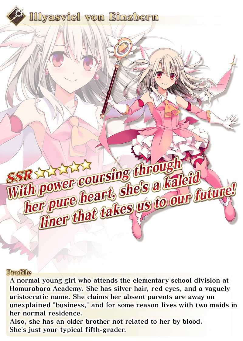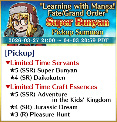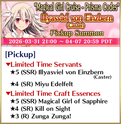 About Featured Servants: * The following Limited Time Servant(s) will only be summonable from the Summon Lineup(s) where they are featured as a Pickup Servant. In addition, they will not be added to Story Summon after the Pickup Summon period ends. - ★5 (SSR) Illyasviel von Einzbern (Caster) - ★5 (SSR) Super Bunyan - ★5 (SSR) Voyager - ★4 (SR) Daikokuten - ★4 (SR) Miyu Edelfelt - ★4 (SR) Kijyo Koyo * Servants added to Story Summon through story progression will not be summonable. Please be sure to confirm the lineup before summoning.