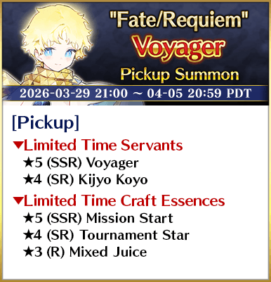 About Featured Craft Essences: * The Limited Time Craft Essence(s) featured in this Summon will only be summonable from the Summon Lineup(s) where they are featured as a Pickup Craft Essence. Please be sure to confirm the lineup before summoning. * The featured ★3 (R) Limited Time Craft Essence(s) will not be summonable from Friend Point Summon.