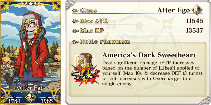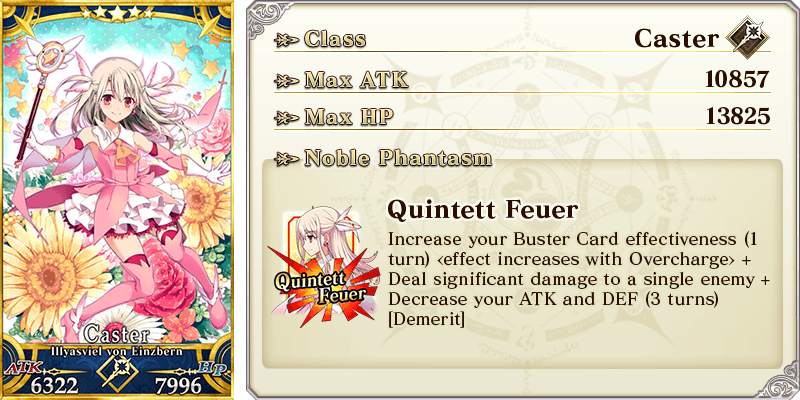 Increase Buster Card effectiveness by 3% & NP Strength by 5% & increase NP Charge by 1 level when using NP (1 time) for yourself Max Limit Break: ATK 1500 HP 0 Increase Buster Card effectiveness by 5% & NP Strength by 10% & increase NP Charge by 1 level when using NP (1 time) for yourself |