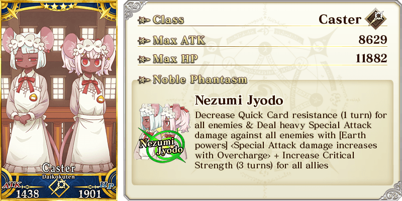 Increase Quick Card effectiveness by 8% & Arts Card effectiveness by 8% & Critical Strength by 8% & begin battles with NP at 40% for yourself Max Limit Break: ATK 2000 HP 0 Increase Quick Card effectiveness by 10% & Arts Card effectiveness by 10% & Critical Strength by 10% & begin battles with NP at 50% for yourself |
