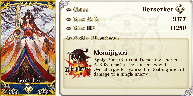 Apply Ignore Invincible & increase Critical Strength by 15% & increase NP Gain by 15% for yourself Max Limit Break: ATK 2000 HP 0 Apply Ignore Invincible & increase Critical Strength by 20% & increase NP Gain by 20% for yourself |
