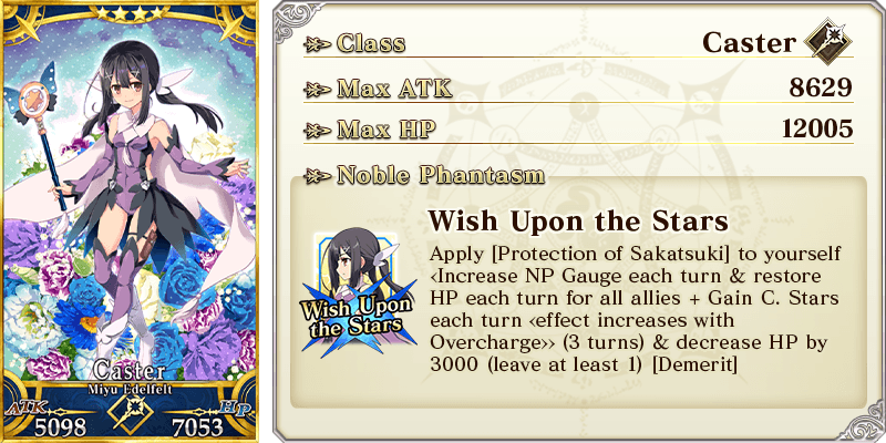 Increase Arts Card effectiveness by 2% & NP Gain by 3% & gain 1 C. Star each turn for yourself Max Limit Break: ATK 500 HP 800 Increase Arts Card effectiveness by 3% & NP Gain by 5% & gain 2 C. Stars each turn for yourself |