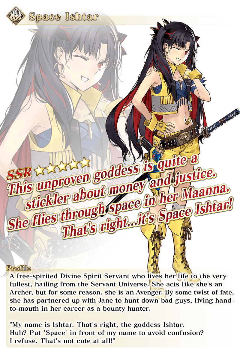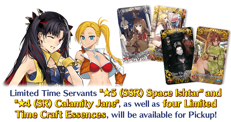 About Featured Servants: * The following Limited Time Servant(s) will not be added to Story Summon after the Pickup Summon period ends. - ★5 (SSR) Space Ishtar - ★4 (SR) Calamity Jane * Servants added to Story Summon through story progression will not be summonable. Please be sure to confirm the lineup before summoning.