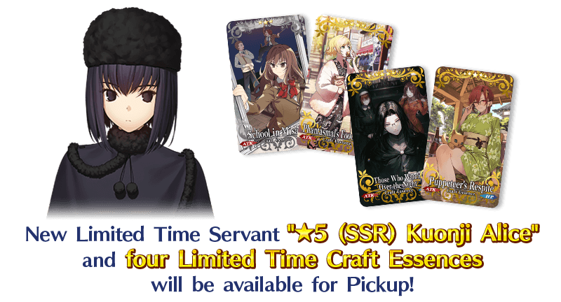 To commemorate the release of the Limited Time Witch on the Holy Night × Fate/Grand Order Collaboration Event "After Witch on the Holy Night/Murder at the Kumano Hot Springs - The Robin Saw It! Magicians Only Live Twice", new Limited Time Servant "★5 (SSR) Kuonji Alice" and four Limited Time Craft Essences will be featured in a Pickup Summon!