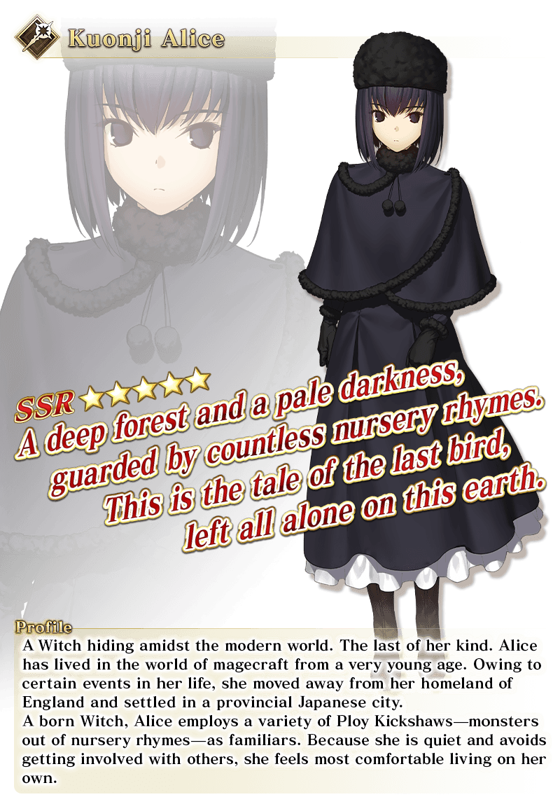 About Featured Servants: * The following Limited Time Servant(s) will not be added to Story Summon after the Pickup Summon period ends. - ★5 (SSR) Kuonji Alice * Servants added to Story Summon through story progression will not be summonable. Please be sure to confirm the lineup before summoning.