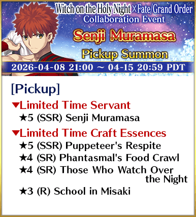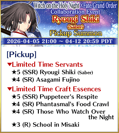 To celebrate the Limited Time Witch on the Holy Night × Fate/Grand Order Collaboration Event "After Witch on the Holy Night/Murder at the Kumano Hot Springs - The Robin Saw It! Magicians Only Live Twice", five Servants, including three Limited Time Servants, and four Limited Time Craft Essences will be featured in three Pickup Summons!