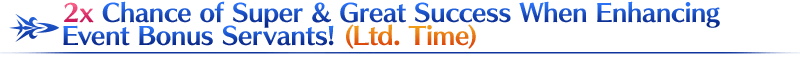 During the period below, the chance of Super Success (double EXP acquired) and Great Success (triple EXP acquired) when performing Enhancement on event bonus eligible Servants will be doubled for a limited time!