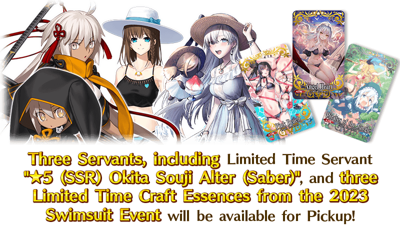 To commemorate the release of the Limited Time Event "Revival: Chaldea Summer Adventure! A Boy Pursuing Dreams and a Girl Who Dreams", three Servants, including Limited Time Servant "★5 (SSR) Okita Souji Alter (Saber)", and three Limited Time Craft Essences from the 2023 swimsuit event will be featured in a Pickup Summon!