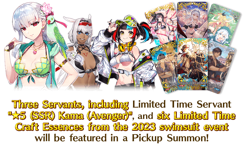 To commemorate the release of the Limited Time Event "Revival: Chaldea Summer Adventure! A Boy Pursuing Dreams and a Girl Who Dreams", three Servants, including Limited Time Servant "★5 (SSR) Kama (Avenger)", and six Limited Time Craft Essences from the 2023 swimsuit event will be featured in a Pickup Summon!