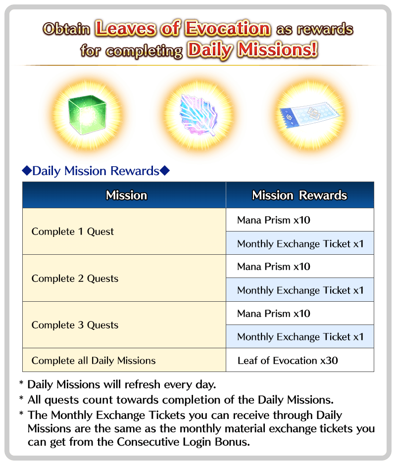 By completing Daily Missions, missions that refresh each day, you can acquire Mana Prisms, Monthly Exchange Tickets, and Leaves of Evocation. This is a great way to obtain Leaves of Evocation outside of limited time Pilgrimage Festivals.