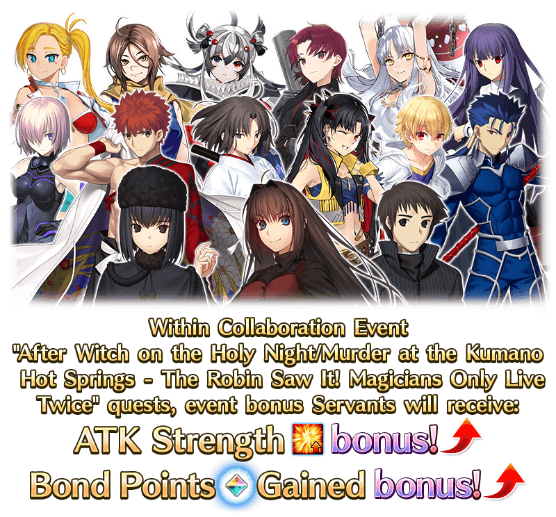 "Witch on the Holy Night × Fate/Grand Order Collaboration Event 'After Witch on the Holy Night/Murder at the Kumano Hot Springs - The Robin Saw It! Magicians Only Live Twice'" Details: